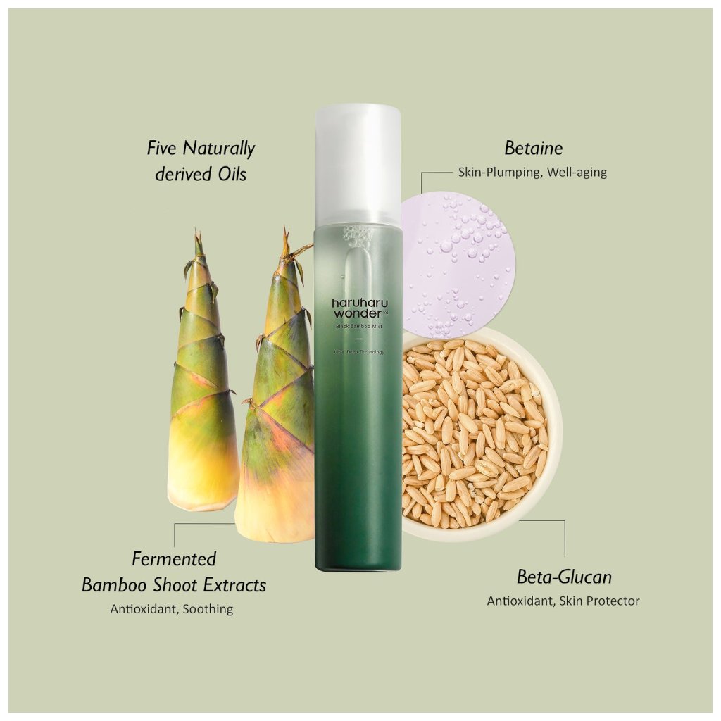 Ľahká hydratačná pleťová hmla s obsahom fermentovaných extraktov z čierneho bambusu poskytuje okamžité osvieženie, hydratáciu a upokojenie pleti. Jemná, ultra-ľahká textúra sa rýchlo vstrebáva bez lepivého pocitu a zanecháva pleť sviežu, hladkú a vyváženú. Zloženie s antioxidantmi z bambusu pomáha chrániť pokožku pred vonkajšími vplyvmi a podporuje jej prirodzenú regeneráciu. Beta-glukán a betaín zároveň hydratujú, upokojujú podráždenie a pomáhajú udržiavať optimálnu úroveň vlhkosti v pleti.