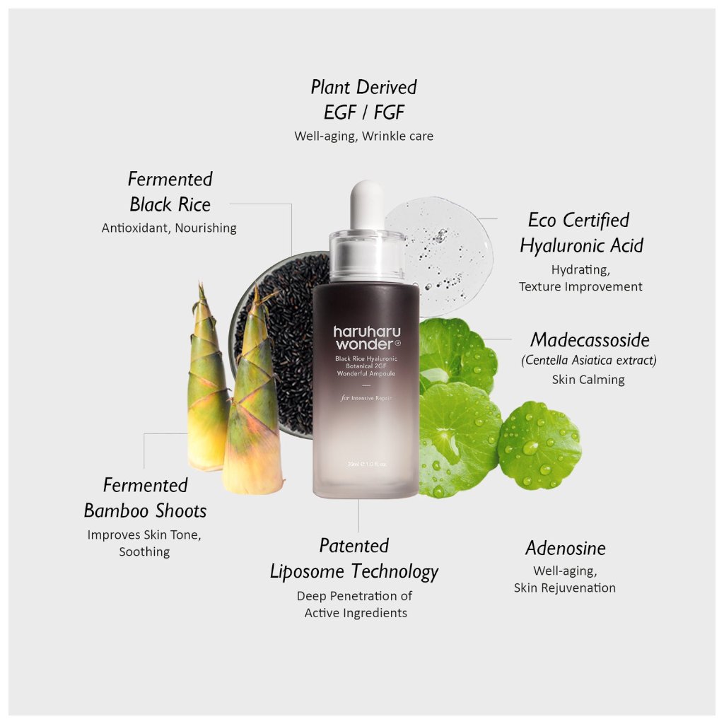 Intenzívne omladzujúce sérum s obsahom fermentovanej čiernej ryže pomáha obnoviť, spevniť a prežiariť pleť. Obsahuje rastlinné EGF a FGF – proteíny podporujúce regeneráciu buniek a obnovu pokožky, čím napomáhajú hladšiemu a mladistvejšiemu vzhľadu. Adenozín redukuje jemné linky a vrásky, zatiaľ čo kyselina hyalurónová intenzívne hydratuje.